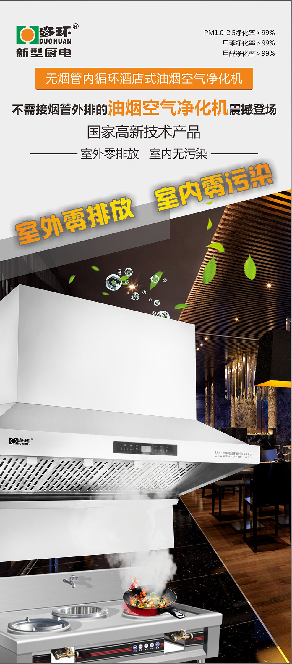 多環(huán)凈化設(shè)備公司研發(fā)生產(chǎn)的無管式內(nèi)循環(huán)油煙凈化機(jī)是不用煙管對外排放的油煙凈化設(shè)備,采用吸排凈化一體機(jī)的形式將烹飪產(chǎn)生的油脂、煙顆粒物及有害氣體(醛、苯、VOCs等)、異味(辣、臭、酸味等)和有害細(xì)菌在室內(nèi)進(jìn)行凈化處理的廚電產(chǎn)品。(*數(shù)據(jù)來源于上海市環(huán)境保護(hù)產(chǎn)品質(zhì)量監(jiān)督檢驗(yàn)總站出具的《檢測報(bào)告》報(bào)告編號:2016|20-35-885523/2016|20-35-885524)